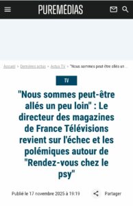 Dans un entretien accordé à la presse, Florent Dumont, directeur des magazines de France Télévisions, revient sur l’échec et les polémiques entourant Rendez-vous chez le psy, admettant : « Nous sommes peut-être allés un peu loin. »